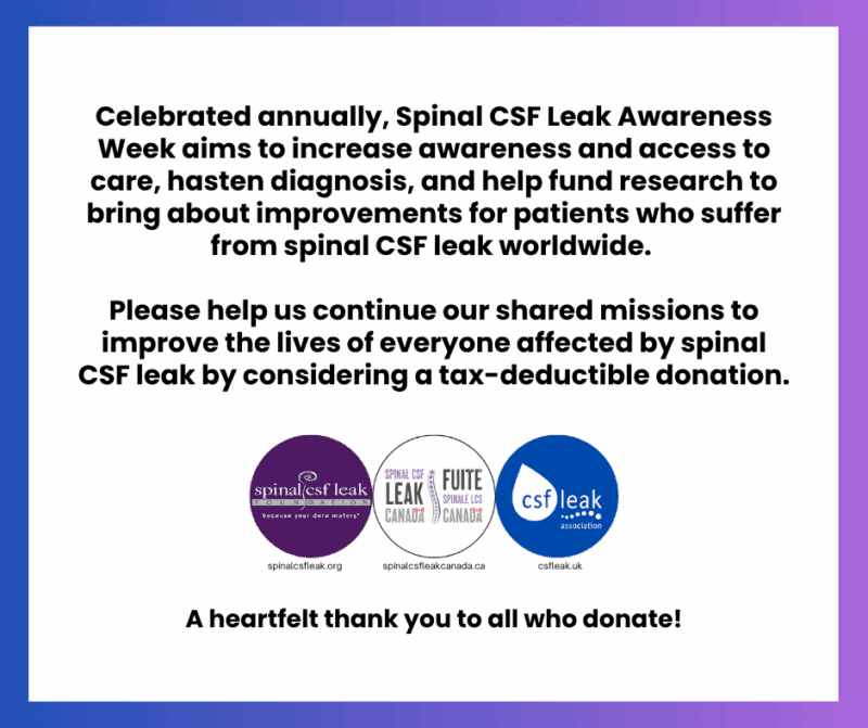 I am reaching about “leakweek”, an annual awareness campaign for spinal cerebrospinal (CSF) leak, which is a debilitating and under-diagnosed condition [that I suffer from / that someone I love suffers from]. This annual campaign is run by the Spinal CSF Leak Foundation, a 501(c)(3) nonprofit health foundation focused on raising awareness, providing education, and funding research for the disorder. The mission at the Spinal CSF Leak Foundation is to reduce the suffering of anyone affected by spinal CSF leak and help patients obtain the correct diagnosis and access to the right testing and treatments, so that more patients will have an improved quality of life.